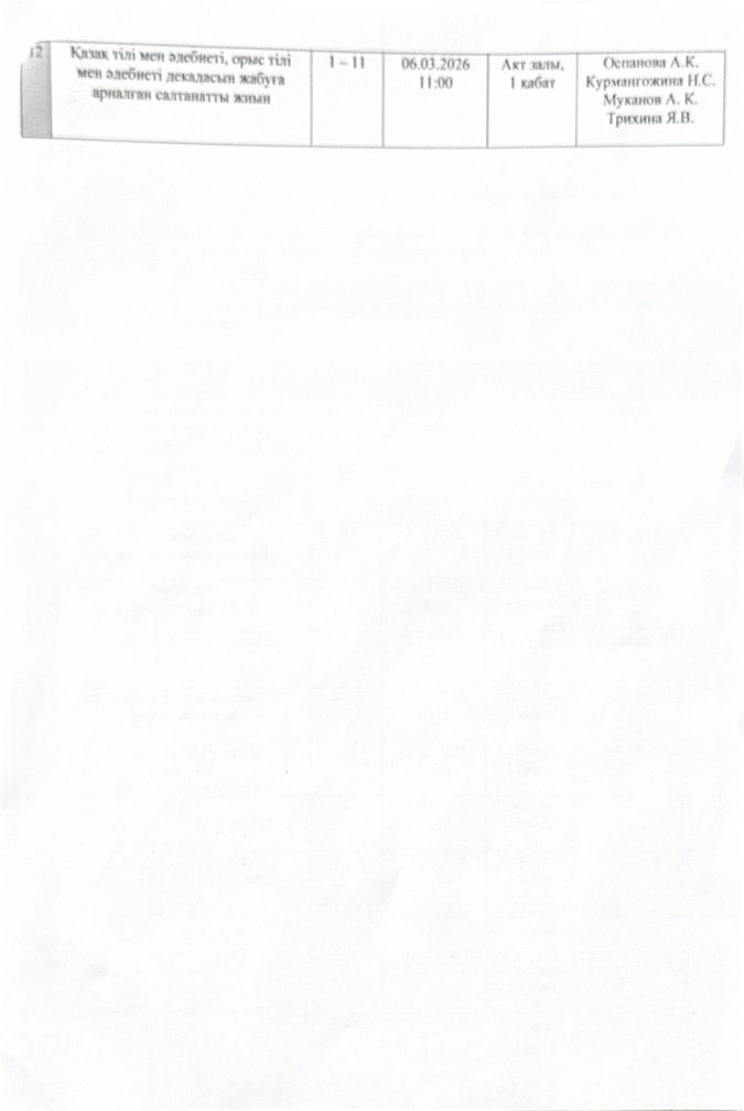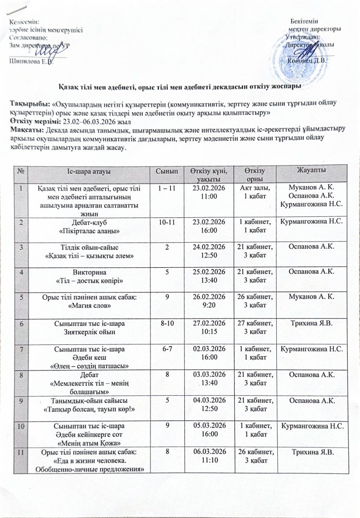 Қазақ тілі мен әдебиеті, орыс тілі мен әдебиеті декадасын өткізу жоспары