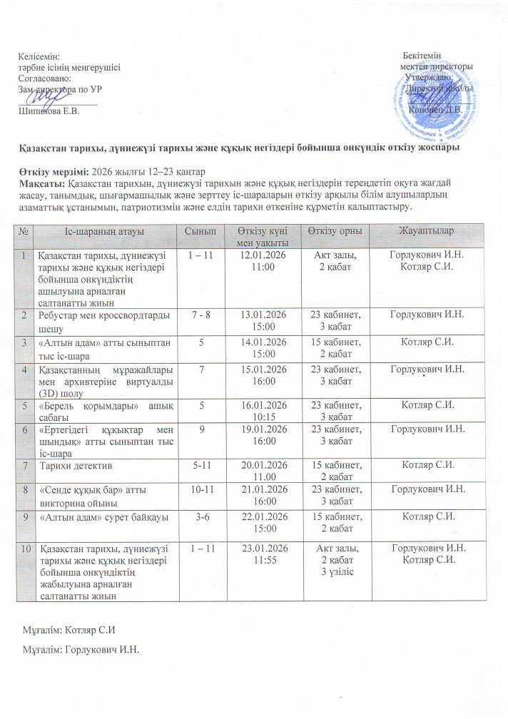 Қазақстан тарихі, дүниежүзі тарихы және құқық негіздері бойынша онкүндік өткізү жоспры